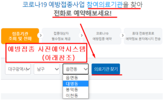 코로나 백신접종 예약 홈페이지(ncvr.kdca.go.kr)에서 병원조회후, 바로 신청하시기 바랍니다.