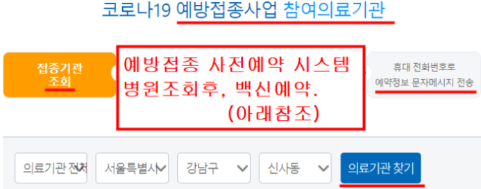 코로나19 예방접종 병원조회, 사전예약 홈페이지.