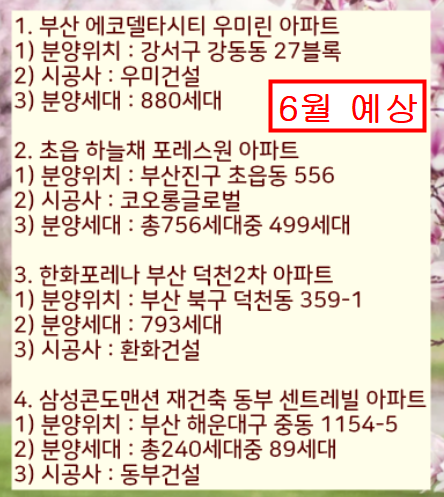 우선 6월에 부산지역에 분양이 예상되는 아파트는 5곳정도가 있습니다.