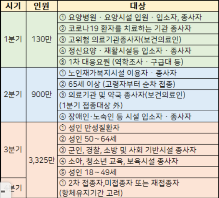 해당 시기별로 신청가능한 대상이 다르니 위에 분기별 코로나 백신 접종 순서표를 다시한번 확인하시기 바랍니다.