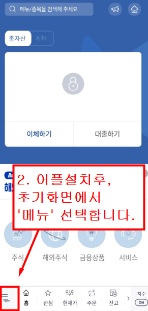 1. 한국투자증권 어플을 설치하고나면 초기화면이 보입니다.