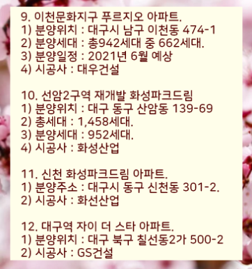 이렇게 2021년 대구에서 분양하는 아파트 목록을 정리하였습니다.