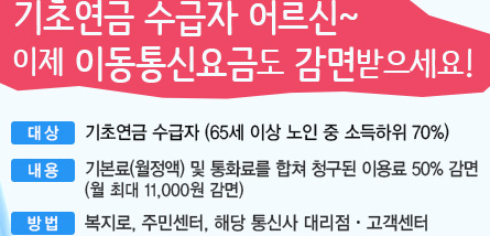 기초연금 수급자 노인분들 대상으로 통신비도 감면 지원합니다.