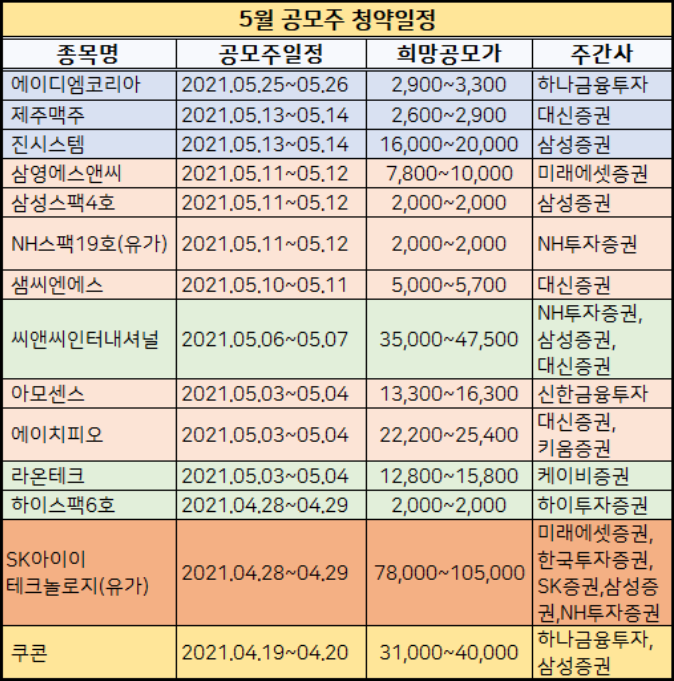 2021년 5월 신규상장 주식 청약일정표