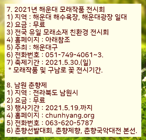 7) 축제기간 : 2021.5.30.(일) / 모래작품 및 구남로 꽃 전시기간.