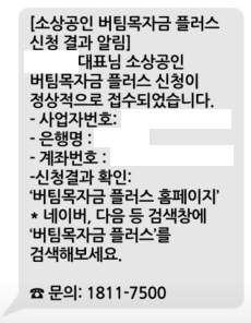 소상공인 4차 재난지원금 '버팀목자금 플러스'를 접수를 마치시면 다음과 같은 문자를 받으실수있습니다.
