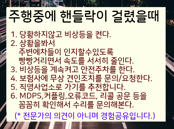 여러분도 운전중에 핸들락이 걸렸을때에 절대 당황하지마시고 안전에 제일 신경써서 사고나지않게 비상등 켜시고 비상주차를 하셔서 보험사 견인조치를 하시기 바랍니다.