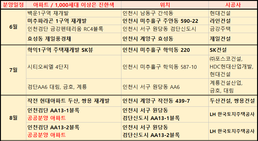 이번에는 2021년 인천 아파트 분양계획 및 청약일정을 표로 정리하였습니다.