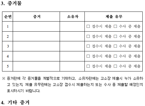 네번쨰. 증거가 있는경우에는 꼭 증거자료를 인용해서 고소장을 작성하는것이 유리합니다.