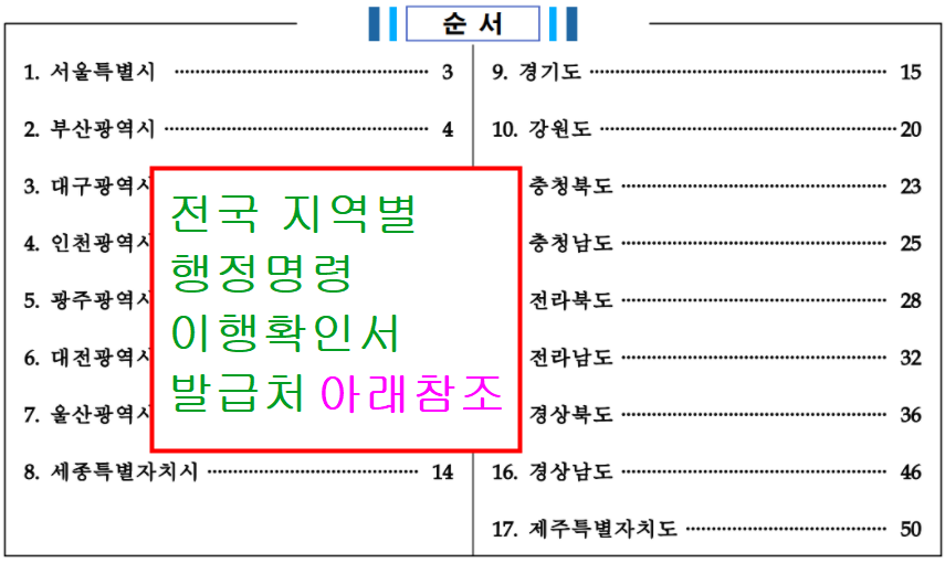 아래, 지역별 행정명령 이행확인서 발급처 확인