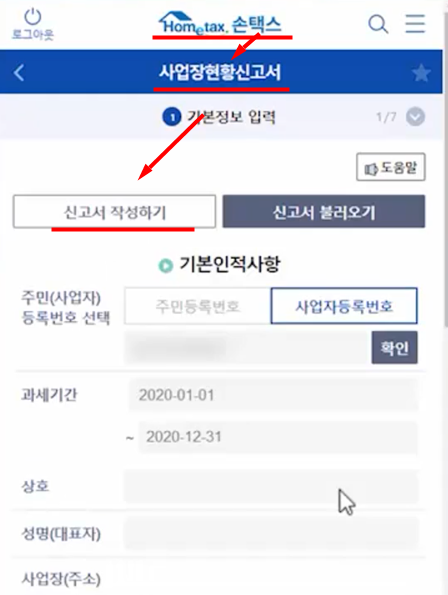 3. 그럼 그림과같이 '사업장현황신고서 작성하기'가 나옵니다.