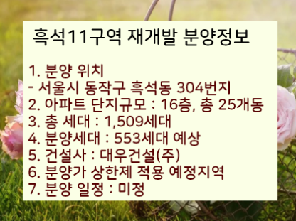 서울시 동작구 흑석동 304번지의 흑석11구역의 분양가 상한제 적용 지역에 위치해있습니다.