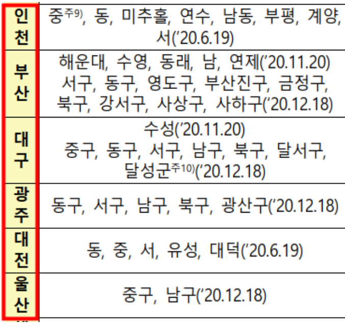 광주의 경우, 동구, 서구, 남구, 북구, 광산구가 2020.12.18. 조정대상지역으로 지정되었습니다.