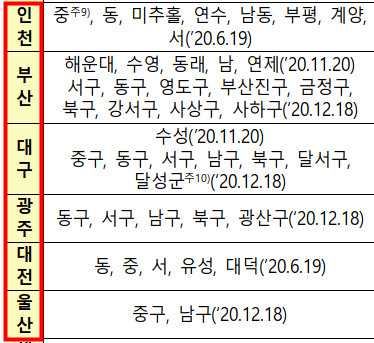 위에는 인천, 부산, 대구, 광주, 대전, 울산지역의 조정대상지역을 정리해논 표입니다.