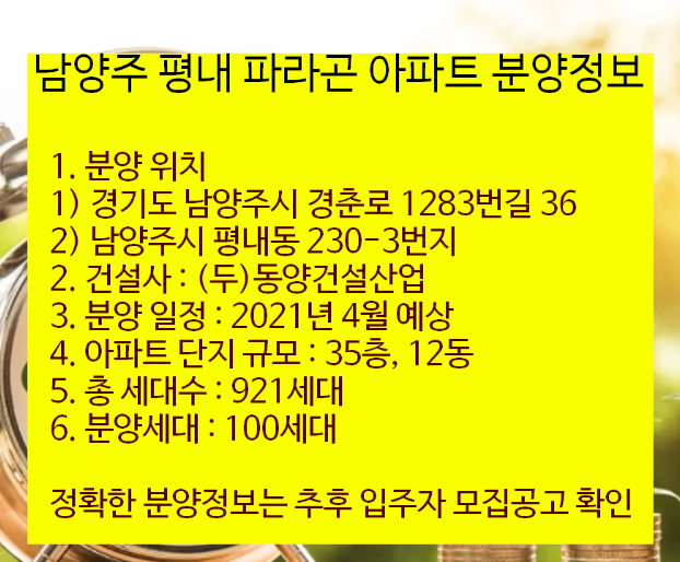 아직 남양주 평내 파라곤 아파트 모집공고가 오픈이 안되었습니다. 평내 파라곤 분양가, 평면도, 청약 일정 등은 추후 분양되는 공식홈페이지에서 입주자 모집공고를 참고바라며, 이 포스팅은 참고로 읽으시기 바랍니다.