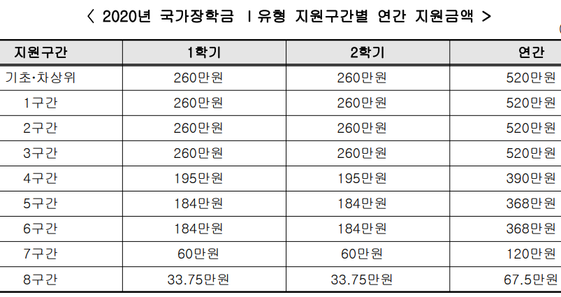 국가장학금 소득분위는 위에처럼 기초생활대상자부터 10구간까지 있는데요. 2020년 기준으로는 연간 지원단가를 보시면 8구간까지만 해당됩니다.