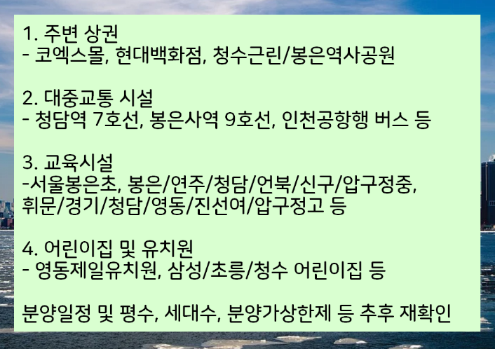 1. 주변 상권 : 코엑스몰과 현대백화점, 청수근린공원 및 봉은역사공원 등이 있으며