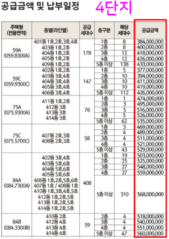 4단지 평수별 아파트 분양가
