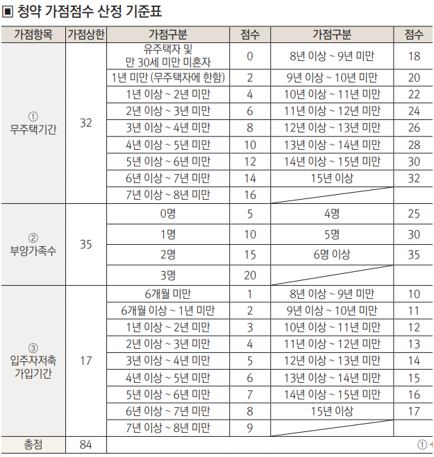 청약 가점점수 및 산정 기준표를 첨부해놨으니 아래에서 참조하시기 바랍니다. 무주택기간 가점이 높은분들은 생애최초특별공급 지원시 유리하실수있으며, 무주택기간 가점이 낮은분들은 신혼부부특별공급을 추천드립니다.