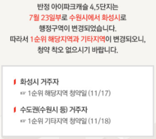 반정 아이파크 캐슬 4,5단지는 7월 23일부로 수원시에서 화성시로 행정구역이 바뀌었다고 합니다. 따라서 1순위 해당지역과 기타지역이 변경되니 이점을 착오없길 바란다고 반정 아이파크 캐슬 홈페이지에서 공지되어있습니다.