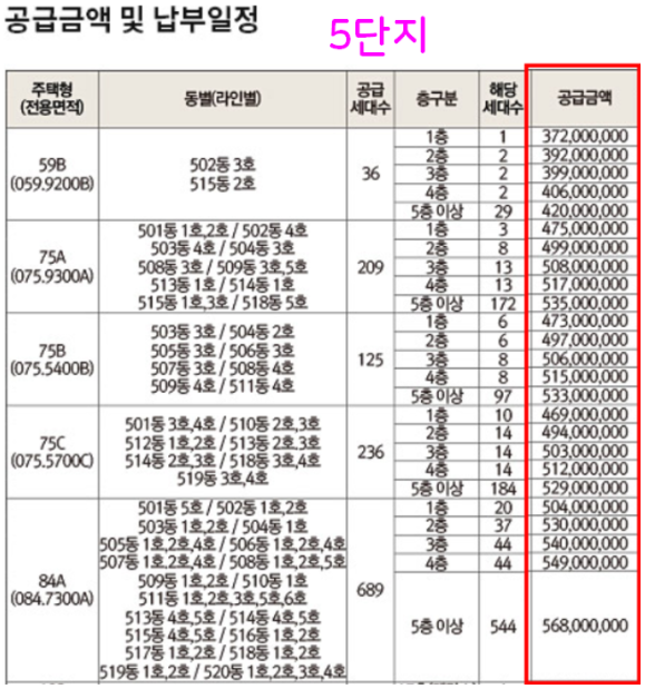 5단지 평수별 분양가 체크