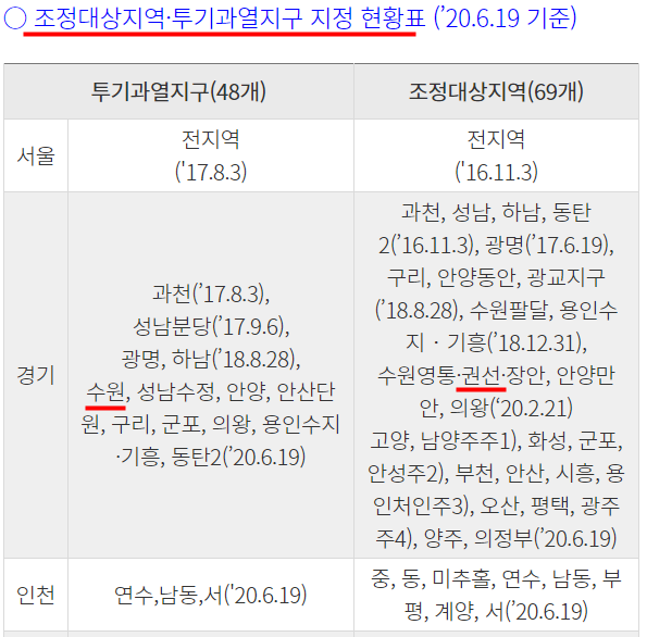 2020년 6월19일 기준으로 조정대상지역과 투기과열지구가 어디인지에 현황표를 참조자료로 알려드리겠습니다.