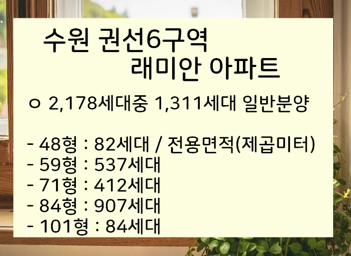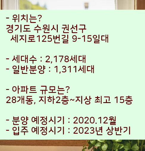 우선 수원 권선6구역의 평수별 분양 세대수와 분양 및 입주시기, 아파트 단지 특징 등 기본적인 것부터 알아보겠습니다.