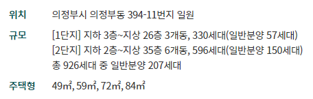 총 926세대중에서 207세대수를 분양할 예정입니다. 지리적으로 의정부역과 회룡역 사이에 사이에 실거주하시면서 교통편도 좋다는 평이 많습니다.