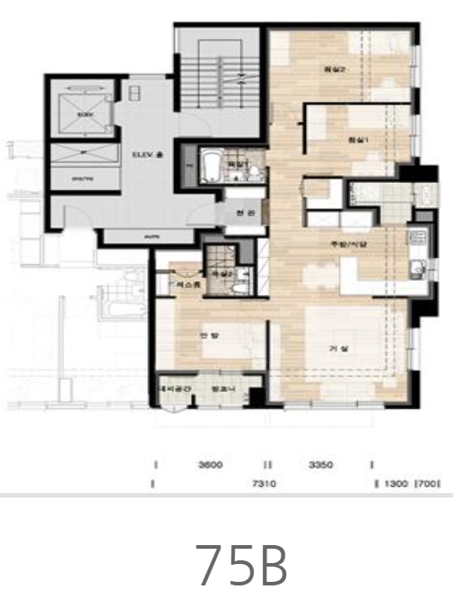 위례 a1-5 평면도중 75B형은 딱 분양되는 아파트중에서 중간 사이즈이며, 주방 및 거실이 넓직해졌습니다. 발코니와 안방에 화장실과 실용적인 작은공간이 있고, 침실 3개가 있습니다.