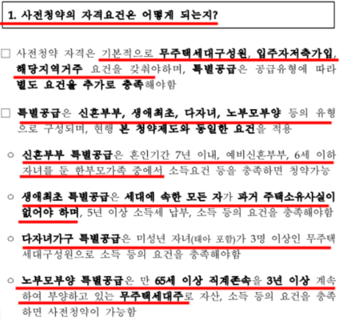 1. 신혼부부 특별공급 : 혼인기간 7년 이내, 예비신혼부부, 6세 이하 자녀 한부모가족.