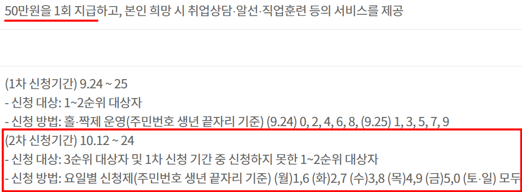 그렇다면 2차로 접수하는 청년 특별구직지원금 지원금은 얼마일까요? 네, 50만원으로 1차때와 동일합니다.