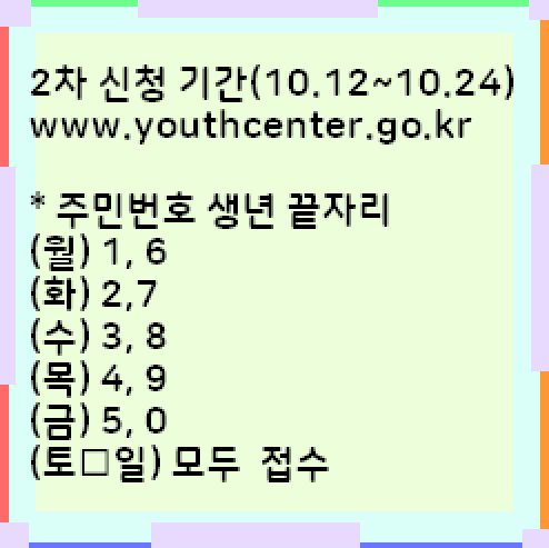 10.12.부터 요일별 신청제로 접수하며 50만원의 2차 청년재난지원금을 지급합니다.