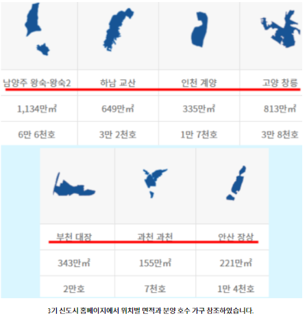 3기 신도시는 위에서 보시는것처럼 경기도 남양주시 왕숙과 하남시 교산, 인천시 계양, 고양시 창릉, 부천시 대장, 과천시와 안산시 장상이 가장 큰 7개의 지역에 위치해 있습니다.