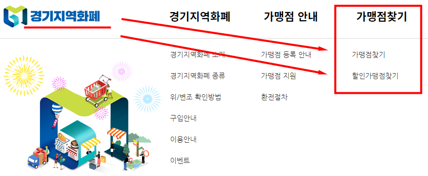 첫번쨰, 앱이 아니라 "경기지역화폐 홈페이지"에서 아래 그림에서 보시는 것처럼 "가맹점 찾기"가 있습니다.