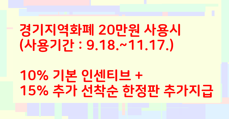 하지만 이번에 코로나로 인해서 지역경제가 활성화가 안되면서 경기도에서 경기도 침체가 장기화된 상권을 살리기위해서 경기지역화폐 20만원을 사용하면 기본10% 인센티브받고 15%를 더해서 추가 지급해준다는 겁니다.