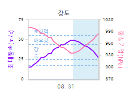 우선 강도를 보시면 중심기압이 최대 1000hps를 육박하는 매우 강한 태풍임을 다시 한번 확인 하실 수 있습니다.