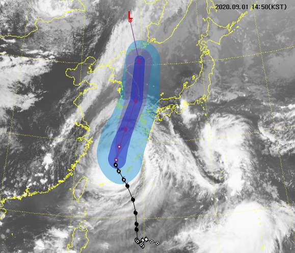 2020.9.2.15시경에 태풍의 영향의 가장 강할 것으로 예상되며, 북북동 방향으로 이동 속도는 22~36km/s라고 합니다. 최대 풍속 초속으로는 43m/s, 시속으로는 155km/h정도 입니다.