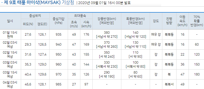 제 9호 태풍 마이삭(MAYSAK) 기상청 | 2020년 09월 01일 04시 00분 발표 태풍 3일예보 일시 중심위치 중심기압(hPa) 최대풍속 강풍반경(km)[예외반경] 폭풍반경(km)[예외반경] 강도 진행방향 이동속도(km/h) 7