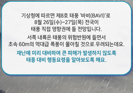 이번 태풍은 8.26.(수)~27(목)에 제주도를 시작으로 목포, 인천, 서울 등 전국적 위치에 엉청난 위력으로 영향권에 들어와서 피해를 줄수 있다고 합니다. 태풍 바비는 초속 60m로 엉청난 속도와 강도로 위력이 어마어마합니다.