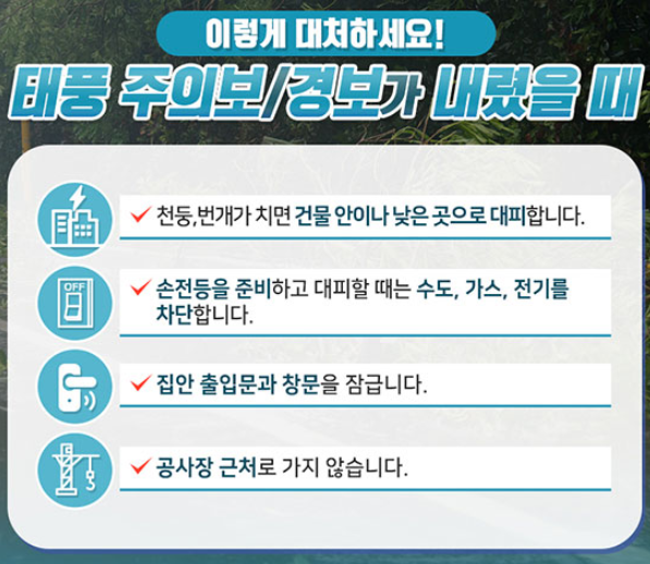 또한 이번에 오는 매미급 태풍, 아니 그보다 더 강할수도 있다고하는 태풍 바비로 인하여 주의보, 경보가 내렸을떄 방재 안전 대비 방법을 알아보겠습니다.