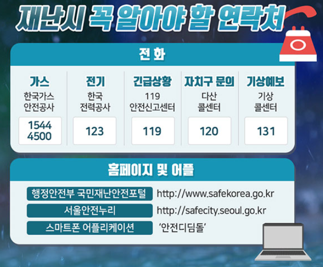 또한 행정안전부 국민재난안전포털과 서울안저누리, 안전디딤돌 등 홈페이지 어플에서 대비 방법을 더욱 잘 정확하게 참고하실 수 있습니다.