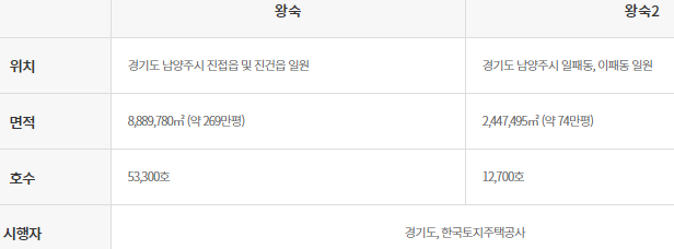 3기 신도시 중 경기도 남양주시의 진접읍 및 진겁읍 일원이 왕숙1, 일패동과 이패동 일원이 왕숙2 지역이라고 합니다. 분양 면적은 왕숙1은 약 269만평과 왕숙2는 약74만평입니다. 호수는 왕숙이 53,300호와 왕숙2가 12,700호입니다.