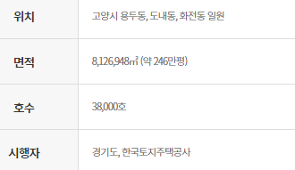 3기 신도시중에 고양시 용두동과 도내동, 화전동 일원을 말하며 면적은 246만평으로 분양 호수는 38,000호입니다. 경기도와 한국토지주택공사에서 시행자라고 합니다.