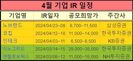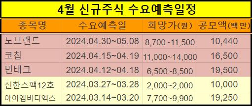 4월 신규 상장주들의 IPO 일정과 수요예측일정들도 따로 표로 정리했습니다.