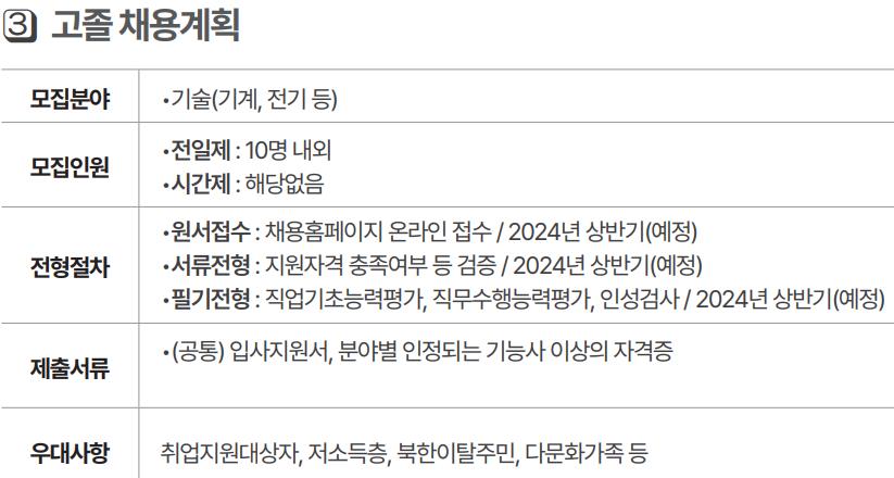 - 서류전형: 지원자격 충족여부 검증, 자격증 및 우대사항 가점 / 2024년 2분기 (예정).