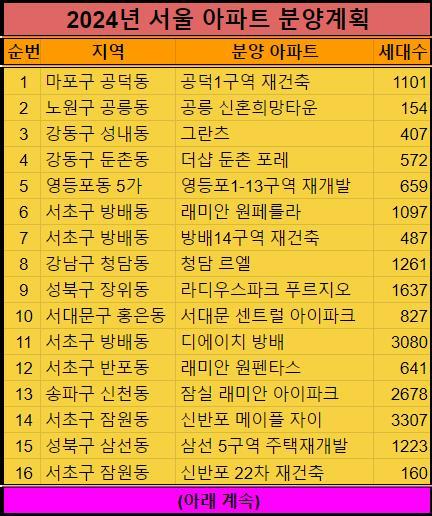 참고하시라고 2024년 서울 아파트 분양일정표도 위에 남겨놨습니다.