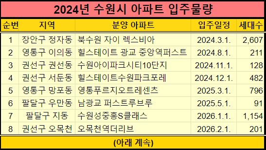2024년 수원시 아파트 입주물량을 표로 정리했습니다.