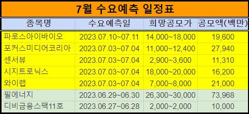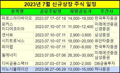 2023년 7월 신규 상장주 IPO 일정을 표로 만들었습니다.