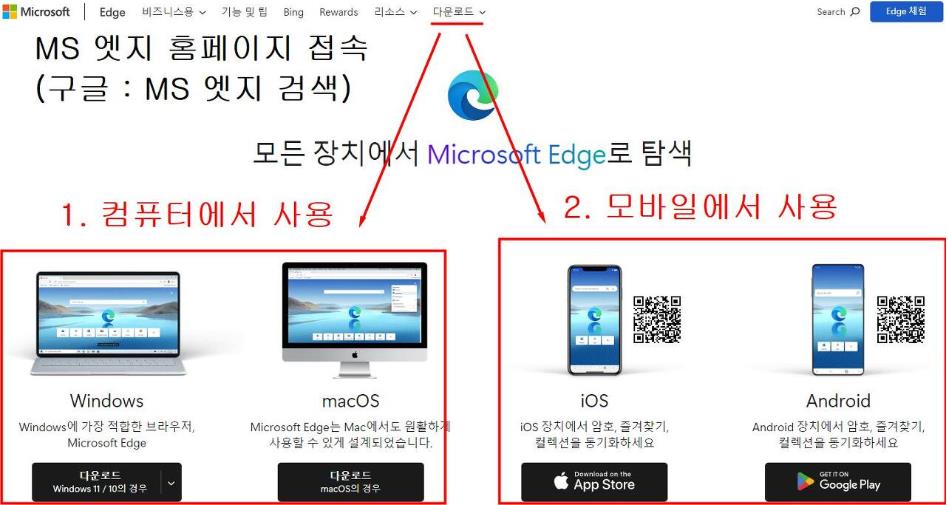 2. 구글에서 'MS 엣지'를 검색하셔서 위 캡쳐화면처럼 홈페이지에 들어갑니다.