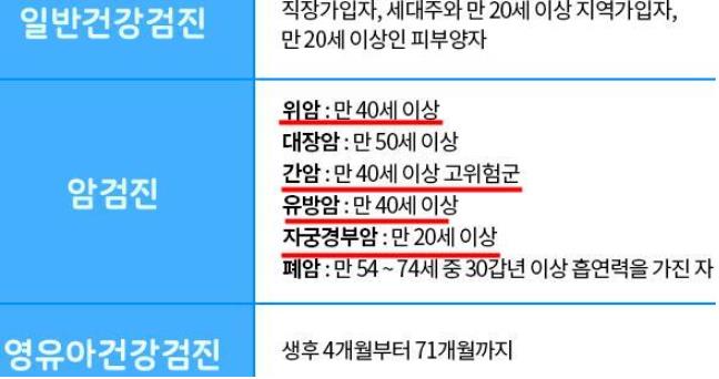 기본 건강검진 항목들 이외의 암검진(위암, 대장암, 간암, 유방암, 폐암 등)도 정부 지원을 받아서 받을수있습니다. 기본검사 외 추가 검진항목들을 선태갷서 종합건강검진을 받으실수있습니다.